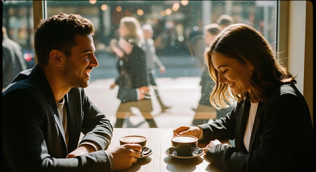 A smiling young man and woman sit closely at a wooden table, enjoying each other's company over a cup of coffee in a bustling cafe with large windows and other patrons.