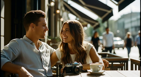 A smiling young couple sits at a table by the window, enjoying coffee and food together, with the man holding a camera and the woman laughing.