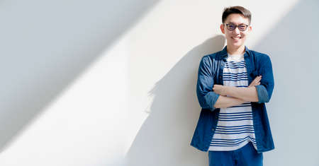 portrait of casual shirt smiling asian male with glasses stading against white wall white shade and light from sun copyspace