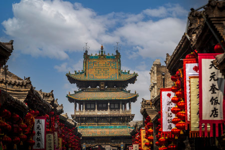 Street view in Old Pingyao town in Shanxi Province of China, with Chinese decoration, architecture and ornaments