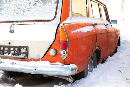 old broken vintage red rusty retro car parked in winter on snow background on frosty winter day