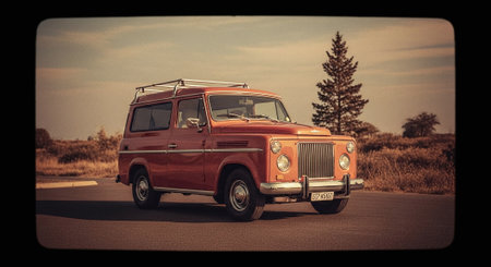 A vintage orange van parked on a road with a scenic background, featuring a roof rack and classic design