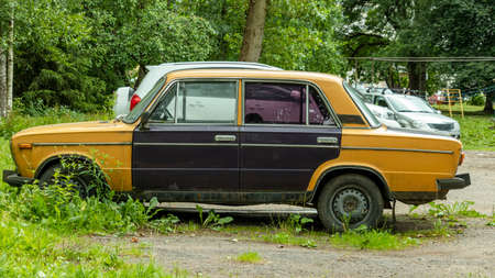 Orange retro car stands in the yard. The car in the station wagon parked on the gravel. Top view of old car