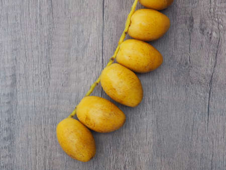 A bouquet of fresh barhee dates palm on the wooden background