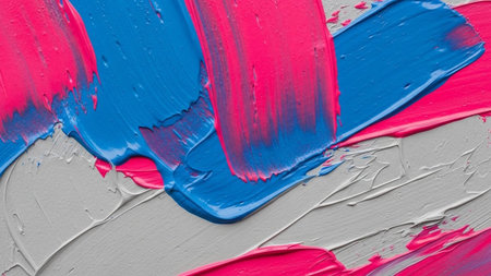 A macro close-up reveals thick, textured paint strokes in bold shades of vibrant pink, electric blue, and neutral gray. The impasto technique is evident, showcasing the rich texture and dimensionality of the paint. The interplay of colors and the visible brushstrokes create a dynamic and expressive abstract composition. highlights the tactile qualities of paint and the raw energy of artistic creation.