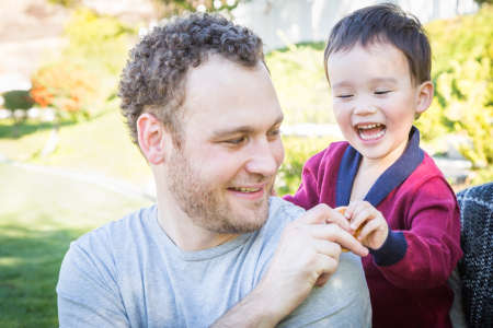 Happy Caucasian Father Having Fun with His Mixed Race Baby Son..
