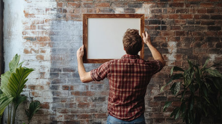 A casual man hanging a rustic wooden frame on a brick wall, creating a cozy home atmosphere