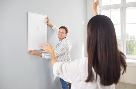 Young family couple hanging picture on a wall in their modern house or apartment. Man and woman who love decorating their home put an art print on the wall in the living room interior