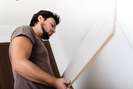 Young caucasian male hanging modern artwork in contemporary living room.