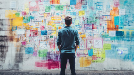 A young woman stands before a colorful wall adorned with an eclectic mix of notes and images. She gazes thoughtfully at the artistic display, capturing the essence of creativity and inspiration in an urban setting.