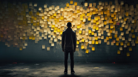 A person looking at a wall covered in papers, possibly brainstorming or planning.