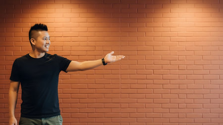 Optimistic Man With Open Palm Brick Red Background