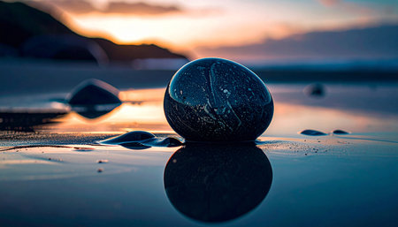 A smooth rock rests on a tranquil surface, beautifully reflecting the vibrant colors of the sunset sky, creating a serene and calming atmosphere.
