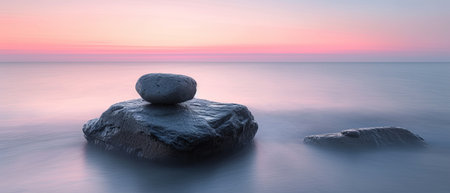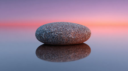 A tranquil scene featuring a smooth stone perfectly reflected in calm water, set against a stunning twilight sky of pink and purple hues.