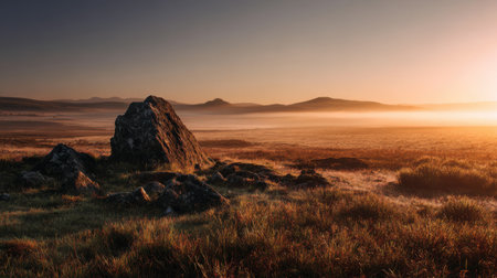 Early dawn light scattering over the rocky ground, soft mist rising, a lone boulder in the middle of the plain bathed in golden brilliance