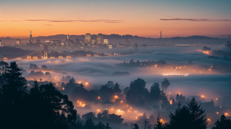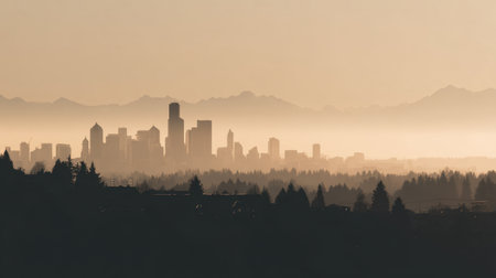 Serene view of a city skyline shrouded in fog and mist, with majestic mountains in the background, capturing the beauty of twilight in Seattle, Washington.
