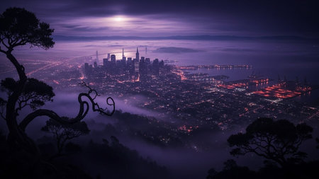 An atmospheric and dramatic aerial view of the San Francisco cityscape at night, enveloped in a thick, mystical purple fog and mist. The city lights twinkle through the haze, creating a surreal and ethereal glow. Iconic structures like the Golden Gate Bridge are faintly visible, adding to the sense of mystery. The foreground silhouetted trees, adding depth and framing the urban expanse. The deep purple hues and the enveloping fog create a moody, cinematic, and unforgettable urban landscape.