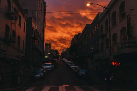 An awe-inspiring aerial perspective captures a sprawling city skyline silhouetted against a dramatic sunset. The sky is ablaze with intense fiery red and orange hues, with dark, brooding clouds adding depth and contrast. The city lights begin to twinkle below, creating a stark contrast with the vibrant sky. The vastness of the urban landscape stretches towards the horizon, with a distant bridge visible, evoking a sense of immense scale and powerful natural beauty.