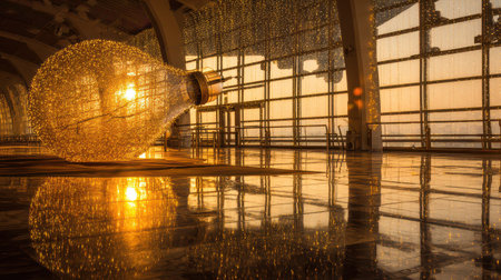 A massive light bulb illuminates the terminal capturing the golden glow of the New Year sunset creating a festive and magical atmosphere.
