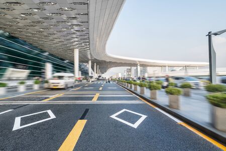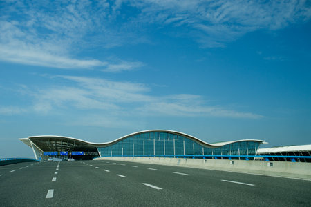 airport terminal against a blue sky with the dynamic background of highway