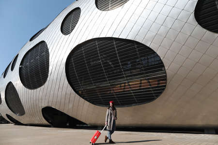 young woman with a red travel suitcase by the futuristic facade of modern architecture. Travel concept