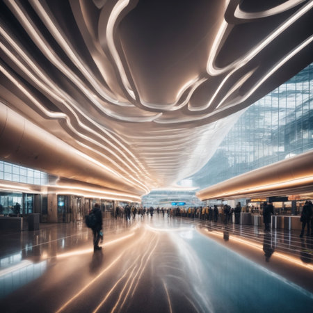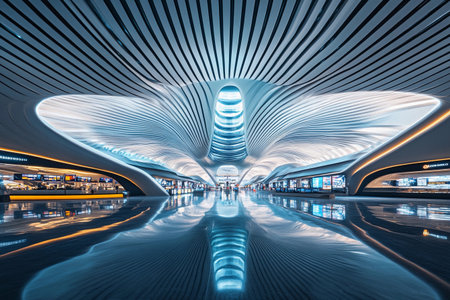 This futuristic airport terminal showcases flowing symmetrical lines and a bright, spacious interior, offering travelers a sleek and modern environment for seamless journeys