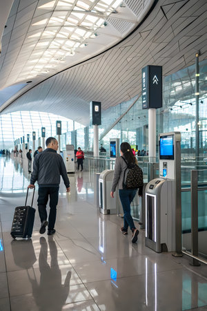 AI generated This image showcases a modern airport check-in area where passengers are using biometric technology, likely facial recognition, for a seamless process. Travelers are moving past sleek, illuminated kiosks or gates, highlighting automated identity verification for faster and more secure airport procedures