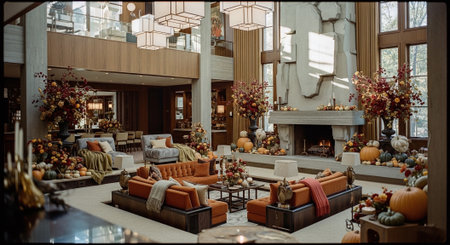 A cozy living room with modern decor, featuring large windows showcasing autumn foliage, stylish furniture, and decorative plants