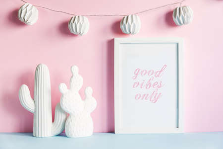 Stylish and modern desk with mock up photo frame, cacti figures and hanging cotton lamps. Pink backgrounds wall. Lovely and design space.