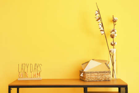 Workplace with notebooks, cotton flowers and text LAZY DAYS near color wall