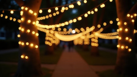 Gentle glow of string lights wrapped around trees illuminating evening festivities, Professional stock photo, AI generated photograph
