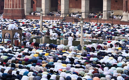 Muslims gathered for Eid prayer, with the Imam leading the congregation. Generative AI