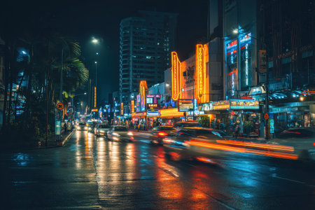 Vibrant city nightlife showcasing neon lights reflecting on wet pavement with bustling traffic in a lively urban setting during twilight