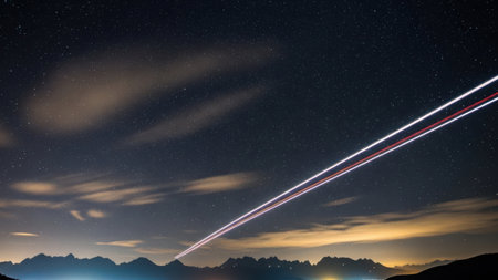 A captivating night sky filled with stars, featuring a prominent airplane trail cutting through the darkness. The image captures the serene beauty of the stars and the distant mountains illuminated by the soft glow of the setting or rising sun.