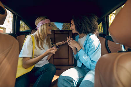 Two cute young women sitting in the car