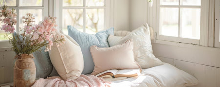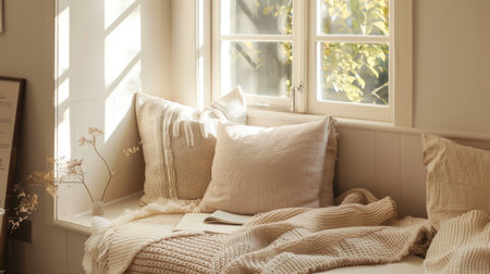 A serene corner is filled with plush pillows and a warm blanket draped over a comfortable seat. Soft afternoon light streams through large windows, creating a peaceful atmosphere.
