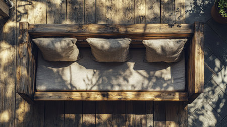 Overhead shot of a rustic wooden bench with cushions, with open space for text or branding.