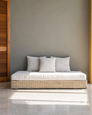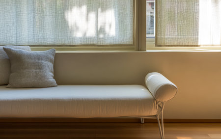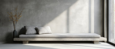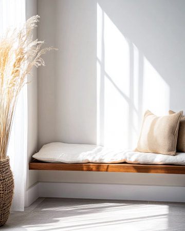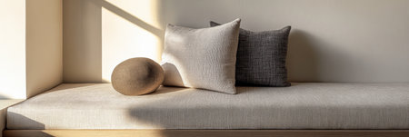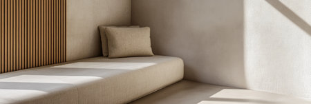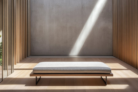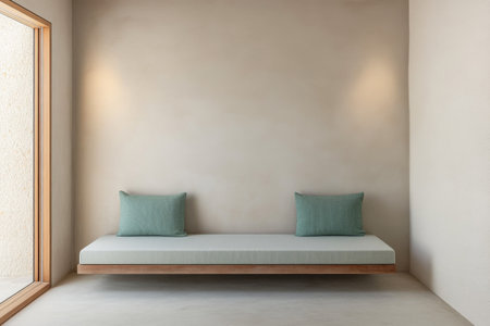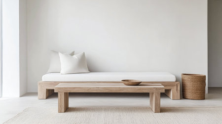 A serene minimalist interior features a simple wooden bench with two soft cushions, illuminated by natural light from a nearby window, creating a calm and inviting atmosphere.