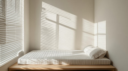 A serene corner of a minimalistic bedroom featuring a simple mattress in soft natural light, casting beautiful shadows through the window blinds.