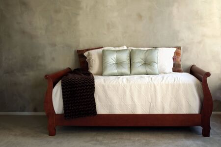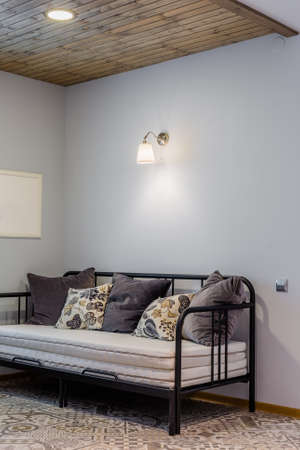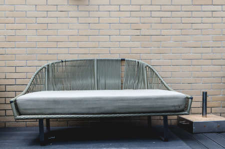Pillows on sofa. Pillow Place squares on a couch on the porch.