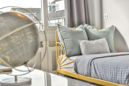 Cropped shot of minimalistic modern bedroom interior with comfy soft bed decorated with gray bedding, selective focus on open blank notepad or book on cover, blurred background