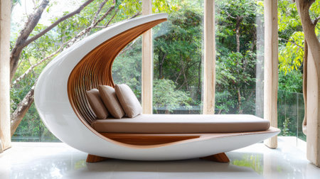 A woman peacefully relaxes on a modern daybed in a sun-drenched, minimalist living room. Sunlight streams through a large window that offers a serene view of water and hills. The tranquil scene embodies concepts of mindfulness, self-care, and finding peace at home.