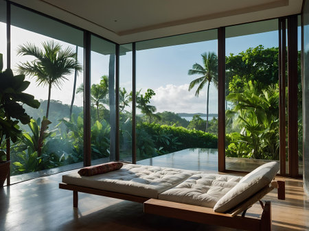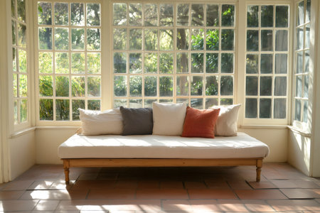 Relaxing scene with a daybed in a sunroom, bathed in natural light from large windows showcasing a peaceful garden view