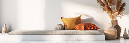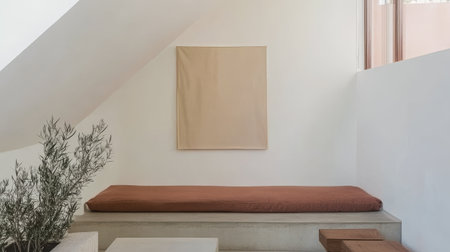 Minimalist interior design composition with a serene room corner, minimal furniture and decoration. Residential interiors in neutral colors with natural lighting.