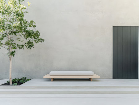 A serene outdoor space features a sleek wooden bench placed on a concrete platform. A small tree adds a touch of greenery beside a contrasting dark door. Natural light enhances the minimalist design.