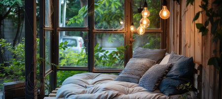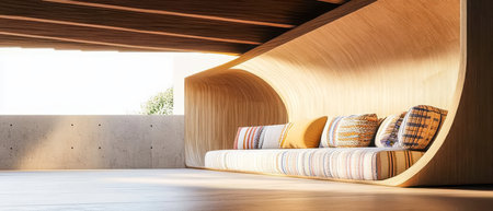 This cozy seating area features a unique wooden structure and colorful cushions illuminated by sunlight streaming through large windows. The minimalist design highlights the natural materials.