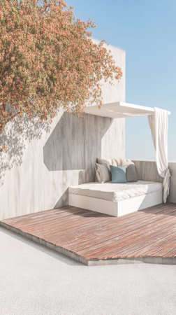 A serene outdoor terrace features a comfortable daybed adorned with soft cushions. Sunlight warms the wooden deck while a tree with pink foliage adds a touch of nature creating a peaceful retreat.