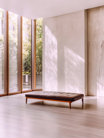 A minimalist space with a sleek bench positioned in front of expansive windows. The bright room is filled with natural light, highlighting simple design and adjacent greenery.