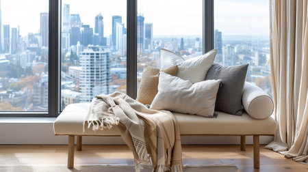 Cityscape Haven This window bench offers a stunning view of the city made even more inviting with plush cushions and luxurious throws to provide a serene escape from the busy street
