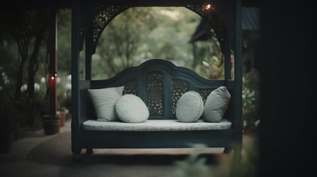a wooden sofa with pillows on the terrace of a modern villa overlooking the sea. Inviting outdoor lounge area with cozy furnishings and ocean backdrop